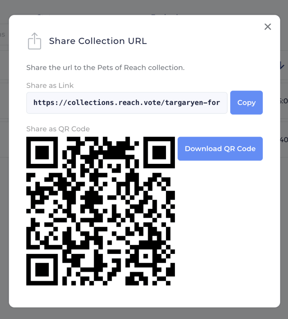 Once your Collection is created, click the share icon next to the URL Slug on the edit form or the main Collections list. You’ll get a pop-up with the URL to copy and a QR code you can download. Share the URL with your supporters and they can then browse and share your content directly from there. Custom domains for your Content Collection are also available upon request.