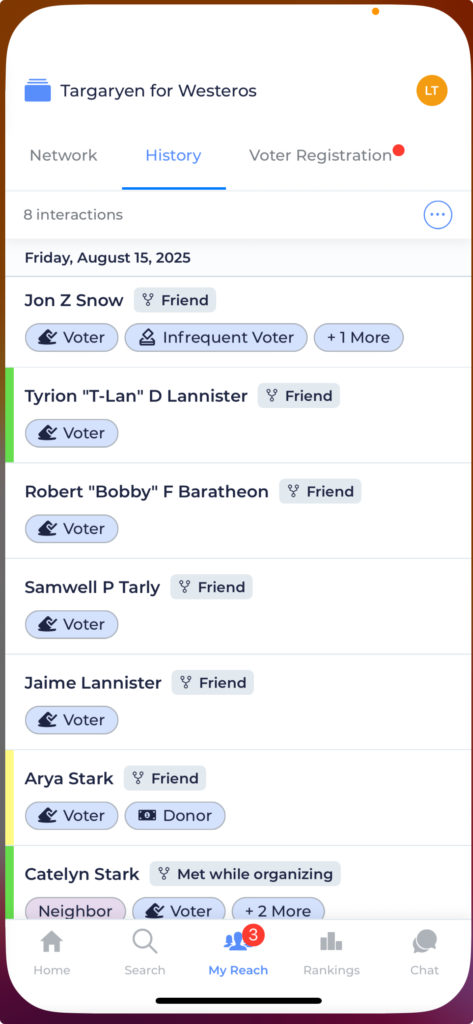 This is where you can see a list of all the voters/respondents you have ever reached. They will be grouped by date, with the most recent contacts at the top. On the left, you’ll see a colored bar indicating that person’s response to your campaign’s primary question.