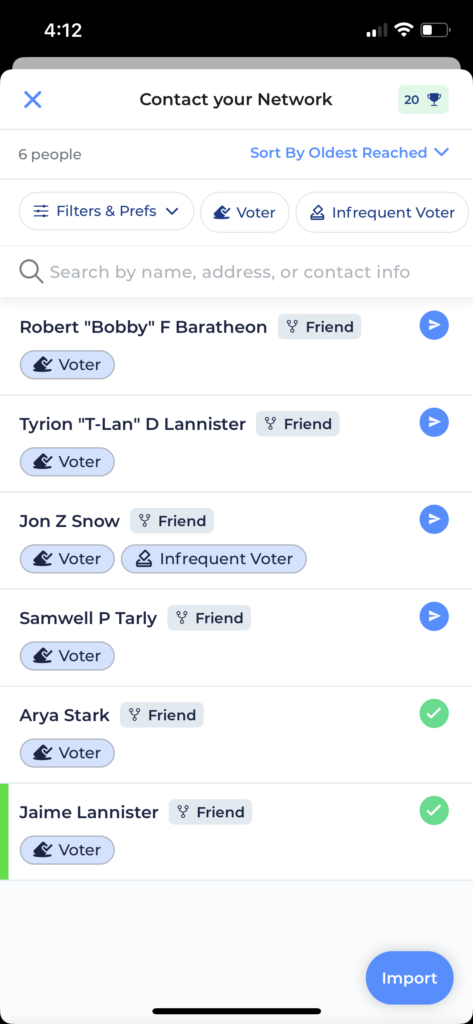 This will open a list of folks in your Network so you can message everyone you know with a pre-filled Contact Script created by your campaign! Everyone will have a Contact button next to their name which looks like a white paper airplane in a blue circle. Tap that button and pick which method you want to use to contact them and we’ll pre-fill the proper script for you. As soon as you send the message, that contact’s button will turn green and you can move on right down the list. You can even sort and filter this list just like the normal Network screen.