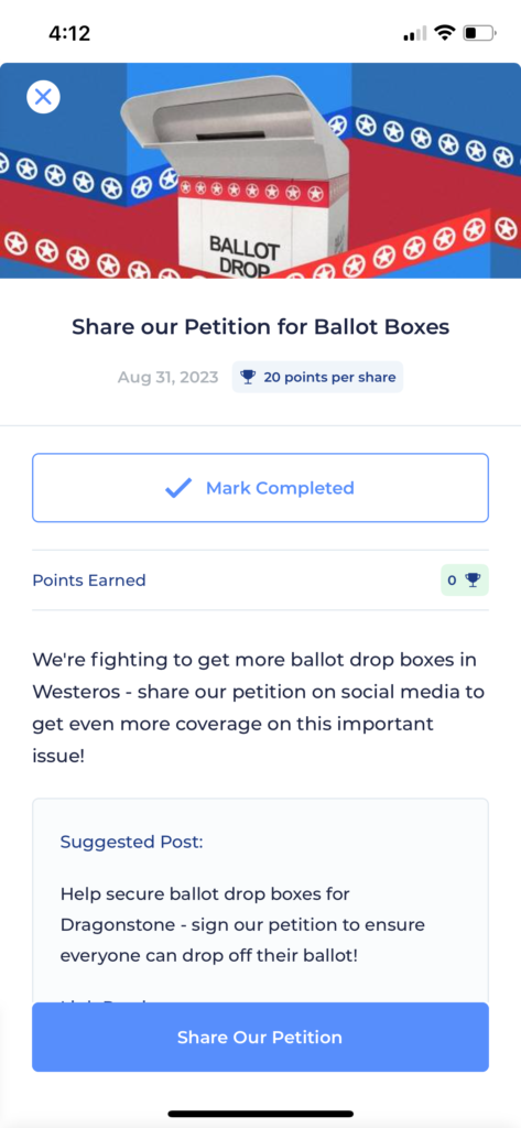 This card type allows you to easily share an image, video, or link from your organization to social media from both the mobile app and the web app. If you’re on mobile, it will pull up your phone’s share sheet, and if you’re on the web, you’ll see a list of places you can share a link or instructions of how to download and share an image or video. Your campaign may even provide you with some suggested post text to include with your post.