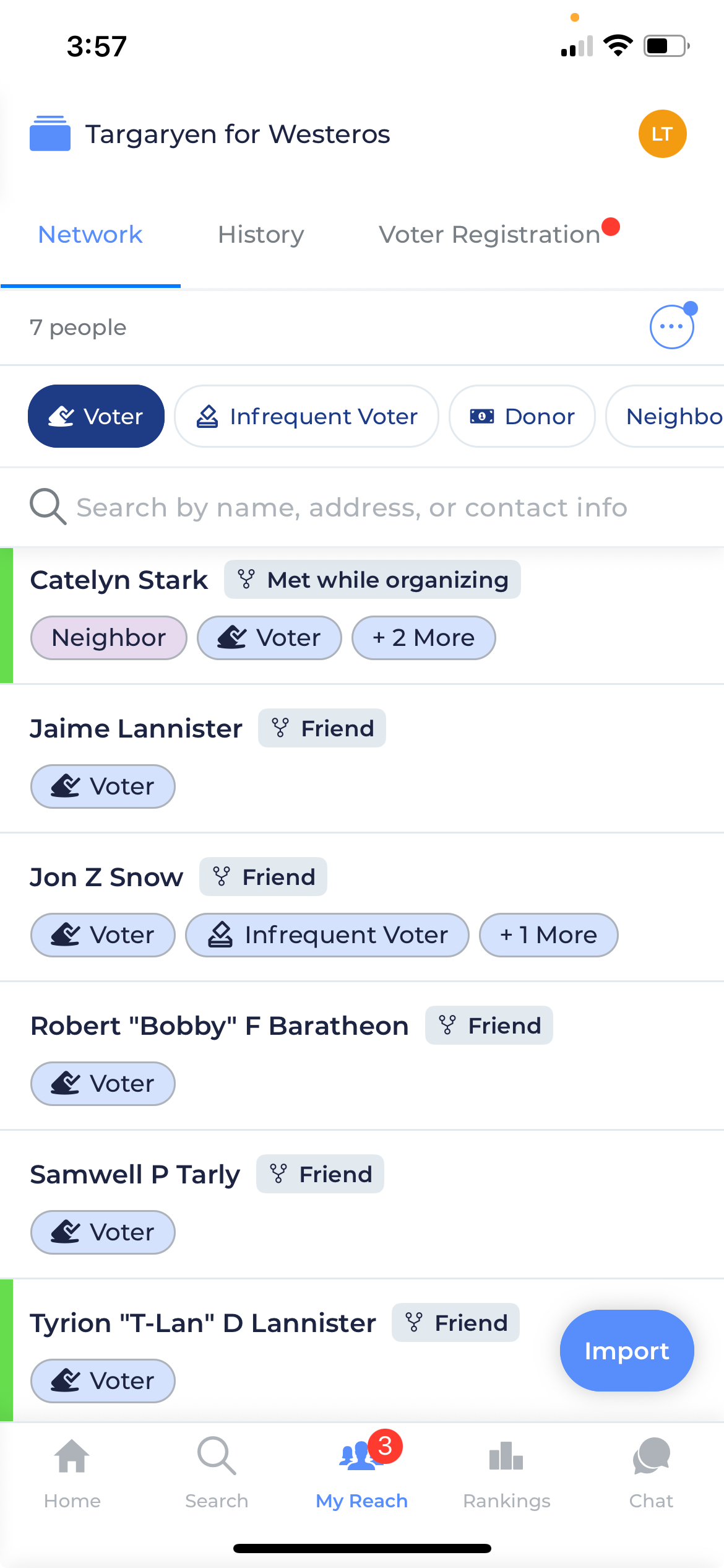 When you want to dive deeper than just browsing your Reach history and seeing all the voters you’ve reached, it’s time to turn to the My Network feature. This feature can be enabled or disabled by a campaign admin or owner so if you’re not seeing it on your campaign, ask the admins!