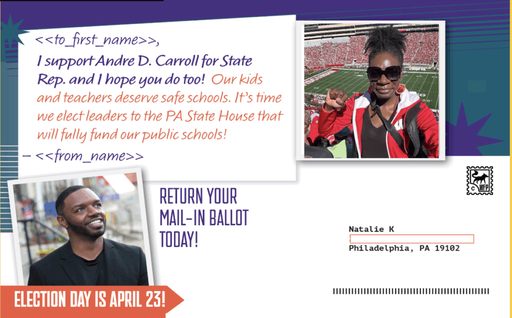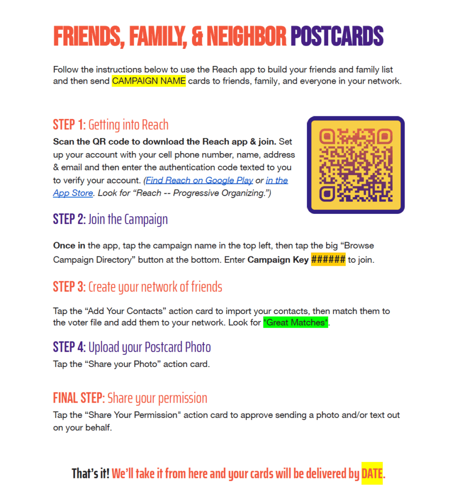 In 2022, WFP developed a creative use of Reach’s Relational Organizing feature: have volunteers map their relational networks and upload a picture of themselves for WFP to mail a printed postcard with the volunteer’s photo to their network. The personalized postcards focused on a message of support for WFP candidates and issues. As the 2024 election season approached, WFP aimed to scale these efforts to increase voter participation and engagement, using Reach to centralize, streamline, and scale their relational postcard program effectively.