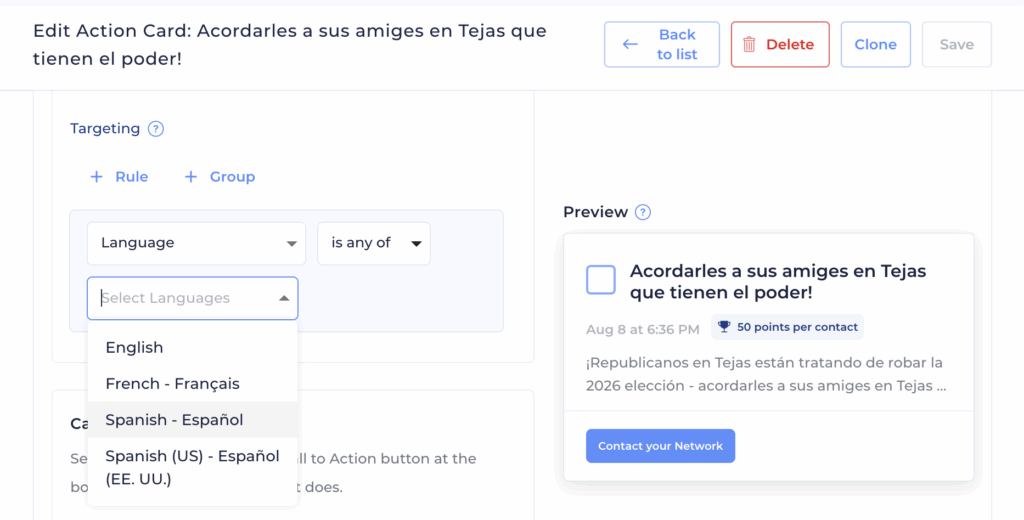 - Targeted Contact Cards: Then, use this data to filter Contact Action Cards. This ensures your volunteers are prompted to contact specific voters with content (like a Spanish-language script or a Vietnamese-language video) that is tailored to their language of choice. Hint: If you choose to use Survey Questions to record the language, consider also making a smart tag based on that survey question to allow Network filtering.